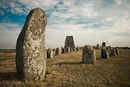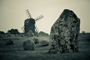 Sweden, Gettlinge Viking stone ship and windmills in Ă–land